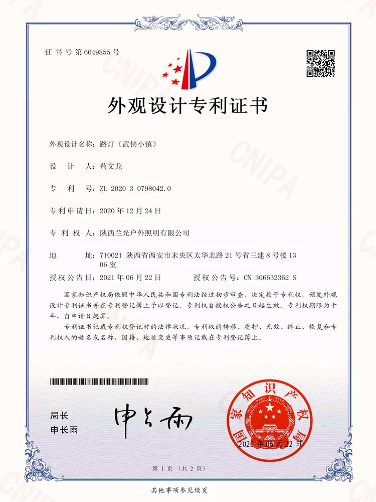 簡介—— 設(shè)計名稱:武俠小鎮(zhèn)景觀燈 設(shè)計用途:園林、景觀照明 專利種類:外觀設(shè)計 專利號:ZL 2020 3 0798042.0