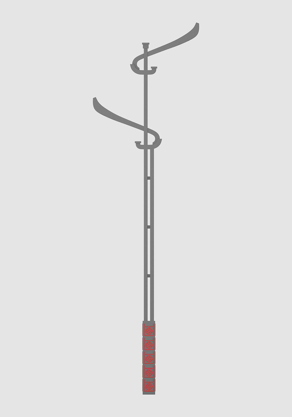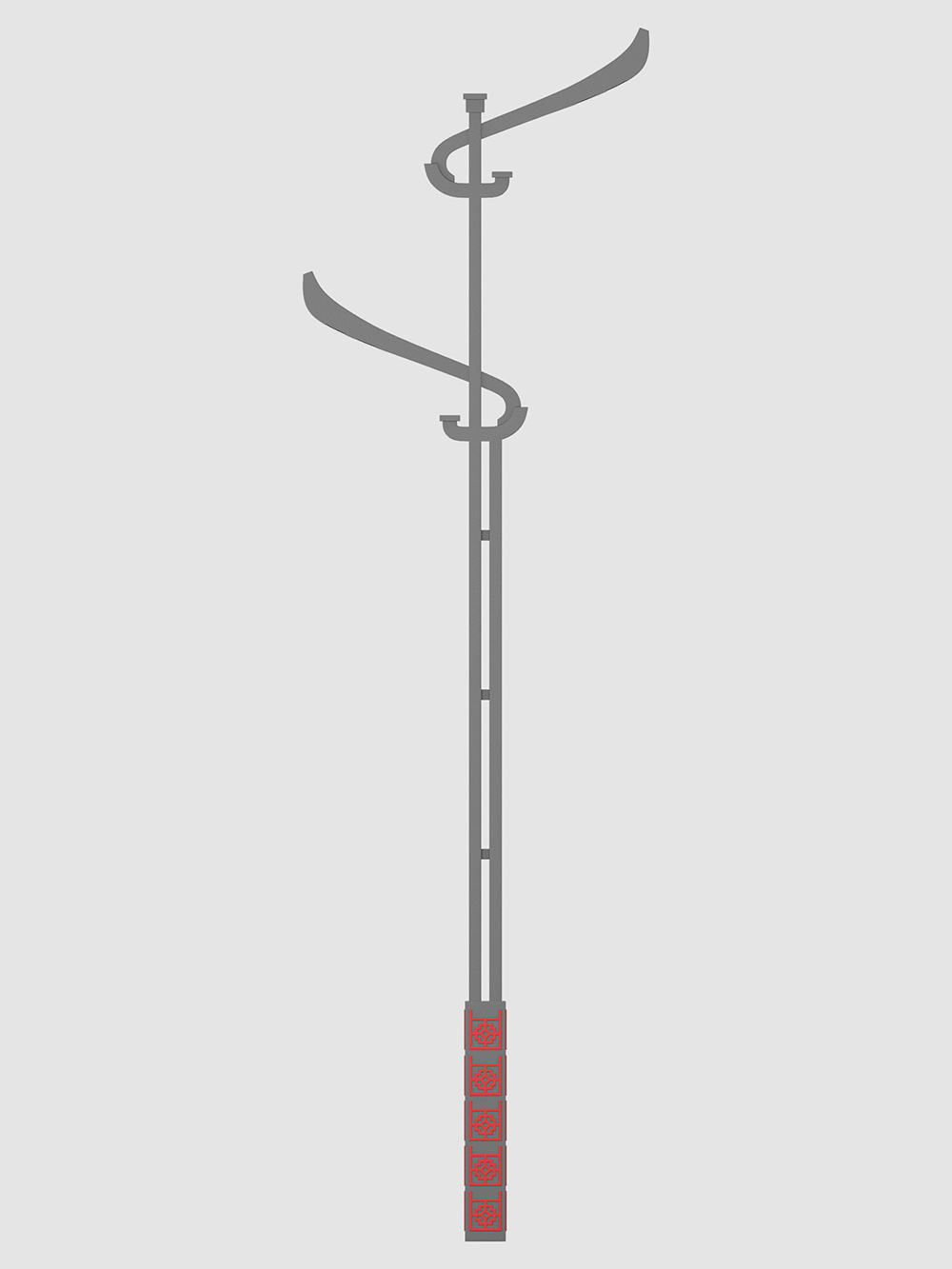 設(shè)計要點:經(jīng)歷時許,方知時光易逝,回首前世,聞見不凡簡史,此燈具借鑒傳統(tǒng)建筑中的斗拱樣式,經(jīng)過簡化修改,燈具上部采用方管拼接,錯位焊接,燈頭部分采用優(yōu)美弧度曲線,頂部采用方形裝飾蓋,下部立體圖案,整體簡潔大氣,優(yōu)雅靈動,適合文化氛圍強的區(qū)域。